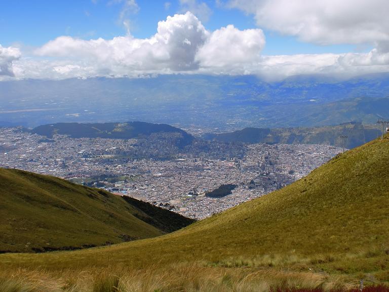 眼下にひろがる首都のキト。よく見れば、自分より下の位置を飛行機が飛んでいる。